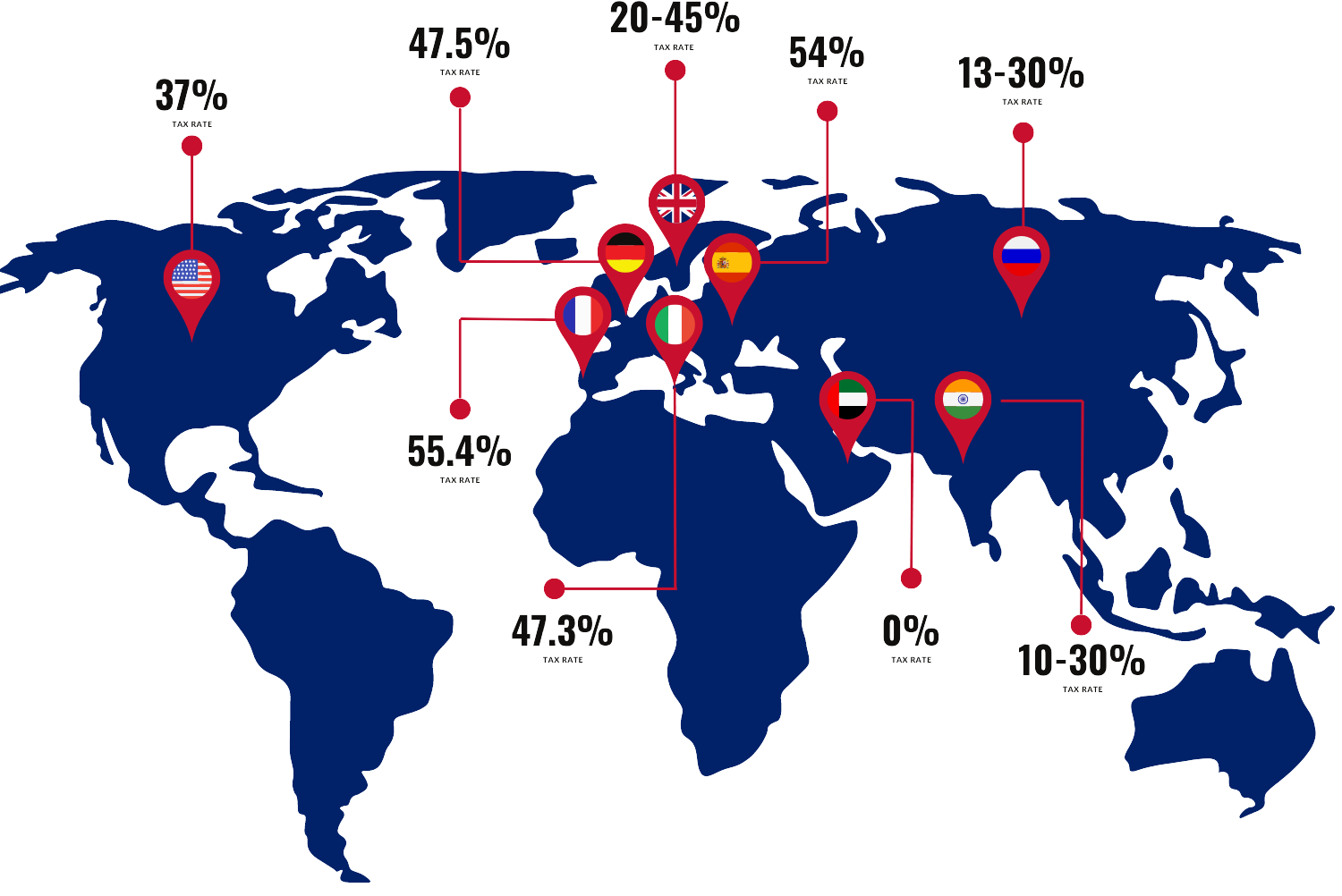 Compared to UAE lowest taxes globally, UK tax rates vary from 20% to 45%, Germany's top rate is 47.5%, France 55.4%, Italy 47.3%, and Spain 54%. In contrast, India's rates span 10% to 30% and Russia uses a flat rate of 13% to 30%.